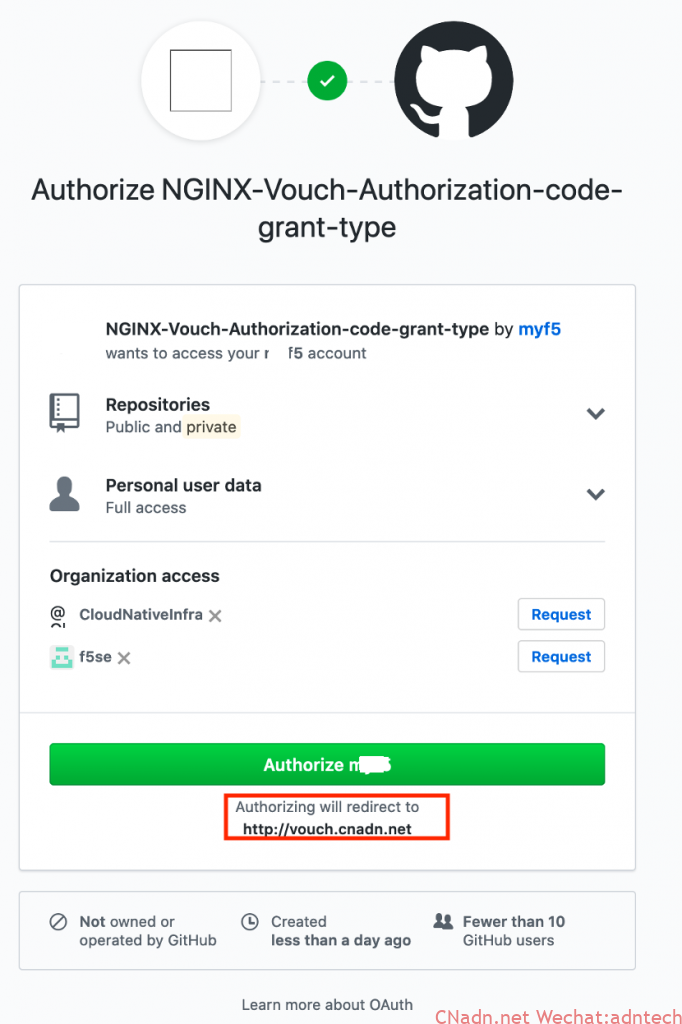 在点击授权后,浏览器会被继续跳转,github的实现会有下面这个跳转提示,这实际是要浏览器跳转给vouch.cnadn.net的回调接口: